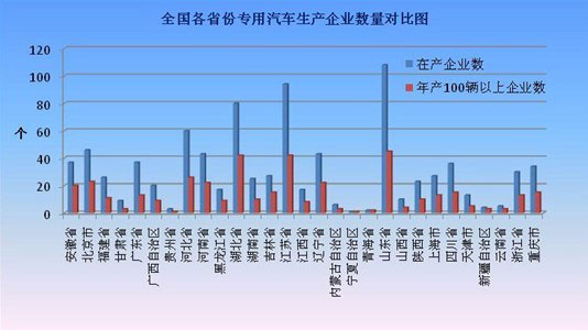 由于專用汽車產(chǎn)品附加價(jià)值較高,各行各業(yè)對(duì)專用汽車的需求日益旺盛,越來越多的企業(yè)加入到專用汽車行業(yè)中來。截至2009年12月底,我國(guó)公告內(nèi)專用車企業(yè)863家,加上公告外有資質(zhì)和無資質(zhì)的企業(yè),估計(jì)全國(guó)實(shí)際企業(yè)數(shù)在1500家左右。這些企業(yè)廣泛分布于我國(guó)31個(gè)省市自治區(qū),其中山東、江蘇、湖北、河北等省份的企業(yè)較多,形成了以山東梁山、湖北隨州為代表的一些產(chǎn)業(yè)聚集地。在日趨激烈的市場(chǎng)競(jìng)爭(zhēng)中,國(guó)內(nèi)商用車整車企業(yè)逐漸向?qū)S密囆袠I(yè)滲透,使得專用車企業(yè)呈現(xiàn)區(qū)域化、規(guī)?;?、集團(tuán)化的發(fā)展趨勢(shì)。