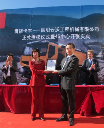 日前,雷諾卡車(上海)有限公司向昆明云沃工程機械有限公司正式授權(quán)并隆重開業(yè)。此家4S店是雷諾卡車在云南地區(qū)建立的第二家功能完備的4S店,它的建立不僅將協(xié)助雷諾卡車完善其營銷網(wǎng)絡(luò),也將助力雷諾卡車進一步加強在專用底盤車市場的份額,提升自己在昆明地區(qū),乃至整個西南地區(qū)的品牌及企業(yè)形象。