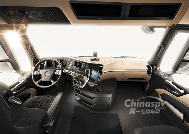 新Actros駕駛室內(nèi)采用全新顏色方案和幾何設(shè)計(jì)來(lái)區(qū)分工作區(qū)和起居區(qū)