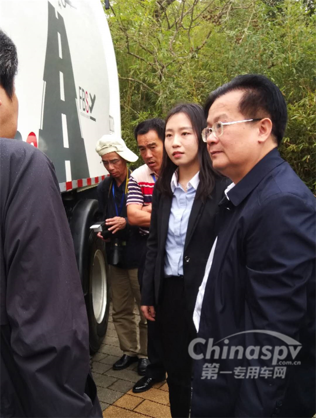 南寧市城市管理局局長梁勇(右一)聽取車型介紹