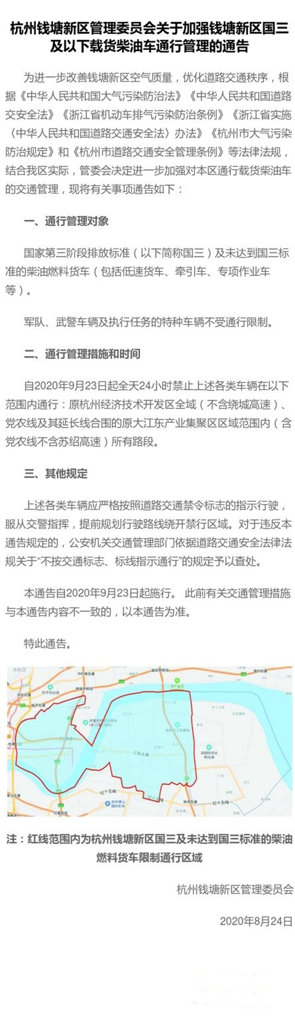 2020年9月23日起,國(guó)三及未達(dá)到國(guó)三標(biāo)準(zhǔn)的柴油燃料貨車全天24小時(shí)禁止在原杭州經(jīng)濟(jì)技術(shù)開發(fā)區(qū)全域(不含繞城高速)、黨農(nóng)線及其延長(zhǎng)線合圍的原大江東產(chǎn)業(yè)集聚區(qū)區(qū)域范圍內(nèi)(含黨農(nóng)線不含蘇紹高速)所有路段通行,具體詳見:
