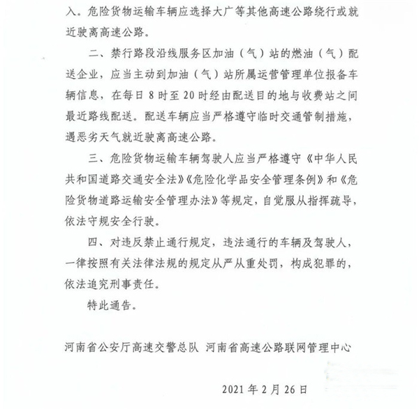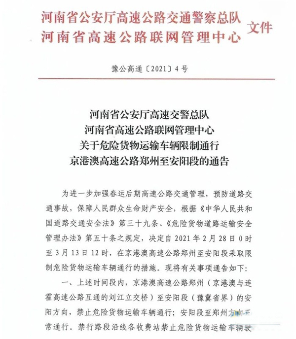 為進(jìn)一步加強(qiáng)春運(yùn)后期高速公路交通管理,預(yù)防道路交通事故,保障人民群眾生命財(cái)產(chǎn)安全,根據(jù)《中華人民共和國道路交通安全法》第三十九條、《危險(xiǎn)貨物道路運(yùn)輸安全管理辦法》第五十條之規(guī)定,決定自2021年2月28日0時(shí)至3月13日12時(shí),在京港澳高速公路鄭州至安陽段采取限制危險(xiǎn)貨物運(yùn)輸車輛通行的措施?,F(xiàn)將有關(guān)事項(xiàng)通告如下:
