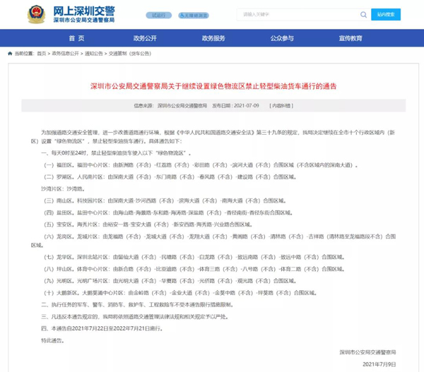 2021年7月12日第一專用車網(wǎng)記者獲悉,近日,深圳市公安局交通警察局發(fā)布《關(guān)于繼續(xù)設(shè)置綠色物流區(qū)禁止輕型柴油貨車通行的通告》。通告指出,為加強(qiáng)道路交通安全管理,進(jìn)一步改善道路通行環(huán)境,根據(jù)《中華人民共和國道路交通安全法》第三十九條的規(guī)定,決定繼續(xù)在全市十個行政區(qū)域內(nèi)(新區(qū))設(shè)置“綠色物流區(qū)”,綠色物流區(qū)內(nèi)全天禁止輕型柴油貨車通行。實(shí)施日期為2021年7月22日至2022年7月21日。原文如下: