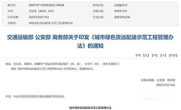 2022年3月15日,交通運(yùn)輸部、公安部以及商務(wù)部聯(lián)合印發(fā)了《城市綠色貨運(yùn)配送示范工程管理辦法》。制定該辦法,是為了加快推動(dòng)城市貨運(yùn)配送體系綠色低碳發(fā)展,進(jìn)一步加強(qiáng)城市綠色貨運(yùn)配送示范工程管理工作規(guī)范化、制度化,保障示范工程建設(shè)有力有序推進(jìn),不斷提升城市綠色貨運(yùn)配送發(fā)展水平,更好服務(wù)加快建設(shè)交通強(qiáng)國(guó)等國(guó)家戰(zhàn)略實(shí)施。
