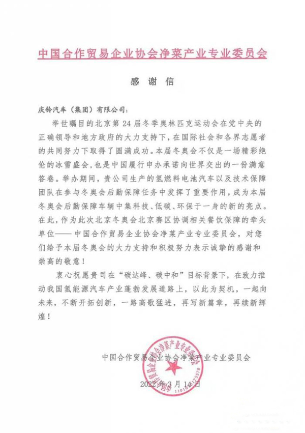 2022年3月份,慶鈴汽車收到了一份來自“中國合作貿(mào)易企業(yè)協(xié)會(huì)凈菜產(chǎn)業(yè)專業(yè)委員會(huì)”的感謝信,表彰慶鈴汽車生產(chǎn)的氫燃料電池車以及技術(shù)保障團(tuán)隊(duì)在參與冬奧會(huì)后勤保障任務(wù)中發(fā)揮的重要作用,稱慶鈴氫燃料車是冬奧會(huì)后勤保障車輛中集科技、低碳、環(huán)保于一身的新亮點(diǎn)。