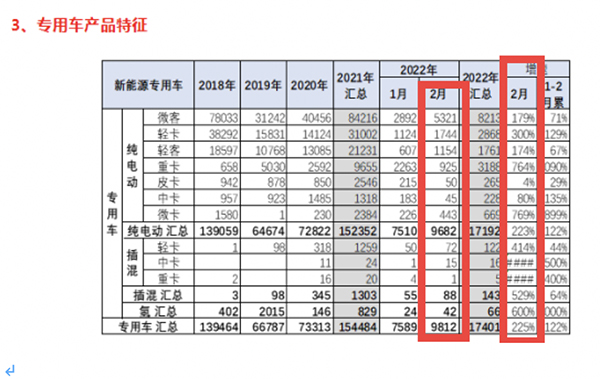 根據(jù)終端上牌數(shù)據(jù),2022年2月各類新能源專用車共計(jì)銷售9812輛(見下截圖,截圖數(shù)據(jù)來(lái)源中國(guó)汽車流通協(xié)會(huì)上牌信息),同比大漲225%,2022年1-2月各類新能源專用車?yán)塾?jì)銷售17401輛,累計(jì)同比大漲122%;