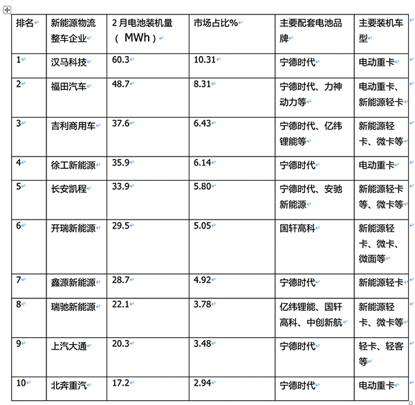 三、2月新能源物流車企電池裝機(jī)量中,漢馬科技、福田汽車、吉利商用車居前三
