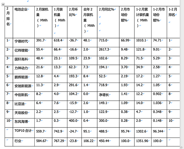 2022年2月及1-2月電池企業(yè)裝機(jī)量top10排行(數(shù)據(jù)來(lái)源:終端上牌信息及電車資源)