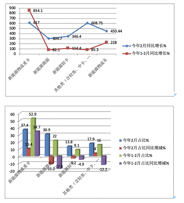 上圖表顯示,今年2月及1-2月新能源物流車各細(xì)分市場(chǎng)電池裝機(jī)量同比、占比及占比同比呈現(xiàn)的特點(diǎn)是: