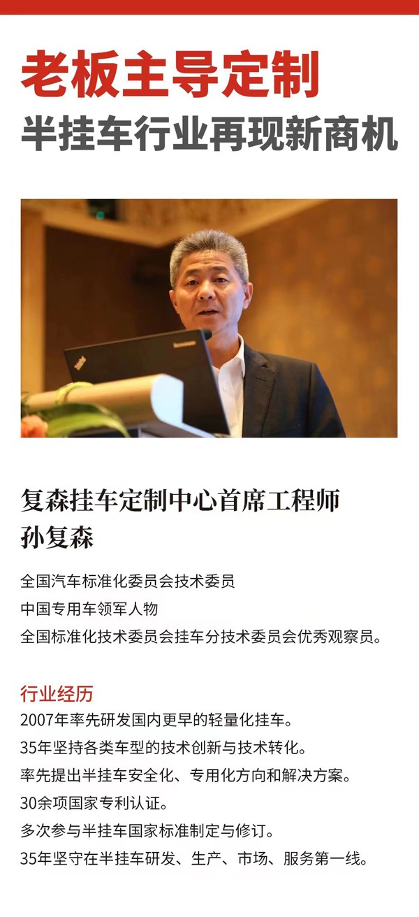 針對眼下經(jīng)銷商不賺錢,產(chǎn)品不專注等問題,作為專用汽車行業(yè)領(lǐng)軍人物,孫復(fù)森敏銳的提出掛車定制的理念。