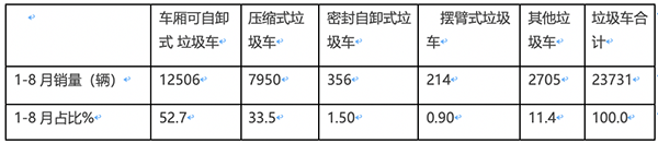 上表可見,2022年1-8月各類垃圾車銷量及占比呈現(xiàn)以下特點(diǎn):