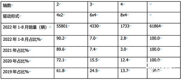 上表顯示,2022年1-8月各類軸數(shù)(驅(qū)動形式)環(huán)衛(wèi)銷量、占比及與近年比較呈現(xiàn)以下特點(diǎn):
