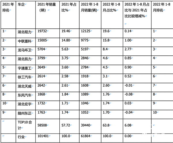 表5,根據(jù)終端上牌信息(不含出口),2022年1-8月環(huán)衛(wèi)車銷量TOP10占比與2021年占比比較: