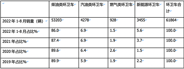 上圖表可見,按動力燃料種類劃分,在2022年1-8月環(huán)衛(wèi)車銷量結(jié)構(gòu)中: