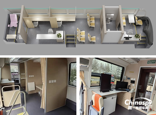 車(chē)內(nèi)功能齊全,采用DR+心電+ B超+婦科+化驗(yàn)區(qū)的布局,配備X線機(jī)、DR設(shè)備、電離室、信息識(shí)別、醫(yī)用顯示器等先進(jìn)儀器設(shè)備,同時(shí)鉛房為6面防護(hù),高于GBZ130-2020放射診斷放射防護(hù)要求。車(chē)內(nèi)的工作臺(tái)均為圓角,有效防止碰傷。