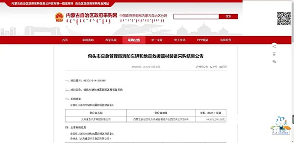 2022年12月30日,內(nèi)蒙古自治區(qū)政府采購(gòu)網(wǎng)發(fā)布了《包頭市應(yīng)急管理局消防車輛和地震救援器材裝備采購(gòu)結(jié)果公告》,北奔重汽成功中標(biāo)包頭市應(yīng)急管理局消防車輛和地震救援器材裝備采購(gòu)項(xiàng)目,中標(biāo)(成交)金額近億元。