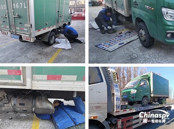 現(xiàn)場情況很復(fù)雜,由于油箱爆裂造成的汽油外漏,非常危險;車內(nèi)拉著快遞,有時效考核,情況十分緊急。郭站長首先安撫客戶情緒,承諾服務(wù)時效;一邊吩咐維修師傅處理好汽油外漏,避免引發(fā)爆燃;一邊和服務(wù)經(jīng)理取得聯(lián)系報備。祥菱的維修師傅不顧冰天雪地的寒冷,在-30℃的嚴(yán)寒情況下奮力搶修,最終將車輛維修好。