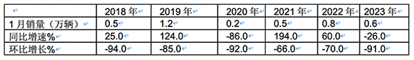 根據(jù)中國(guó)汽車流通協(xié)會(huì)提供的終端上牌信息,2023年1月新能源專用車銷售0.6萬(wàn)輛,環(huán)比(-91%)同比(-26%)雙下降(見(jiàn)截圖1)。