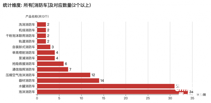 本次公告中的128款消防車共包含18種車型,泡沫消防車(34輛)、水罐消防車(31輛)、器材消防車(14輛)、壓縮空氣泡沫消防車(12輛)、通信指揮消防車(7輛)、搶險救援消防車(6輛)、舉高噴射消防車(4輛)、泵浦消防車(4輛)、自裝卸式消防車(3輛)、軌道消防車(2輛)、機場消防車(2輛)、洗消消防車(2輛)、干粉泡沫聯(lián)用消防車(2輛)、干粉消防車(1輛)、勘察消防車(1輛)、供液消防車(1輛)、干粉水聯(lián)用消防車(1輛)、照明消防車(1輛)。