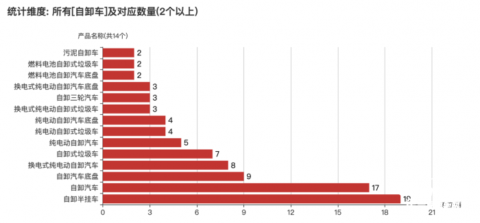 本次公告中的91款自卸車共包含17種車型,自卸半掛車(19輛)、自卸汽車(17輛)、自卸汽車底盤(9輛)、換電式純電動自卸汽車(8輛)、自卸式垃圾車(7輛)、純電動自卸汽車(5輛)、純電動自卸式垃圾車(4輛)、純電動自卸汽車底盤(4輛)、自卸三輪汽車(3輛)、換電式純電動自卸式垃圾車(3輛)、換電式純電動自卸汽車底盤(3輛)、污泥自卸車(2輛)、燃料電池自卸式垃圾車(2輛)、燃料電池自卸汽車底盤(2輛)、插電式混合動力自卸汽車(1輛)、燃料電池自卸汽車(1輛)、插電式混合動力自卸汽車底盤(1輛)。