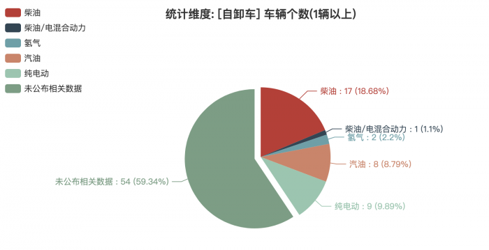 本次公告中的91款自卸車中,柴油(17輛,占比18.68%)、柴油/電混合動力(1輛,占比1.1%)、氫氣(2輛,占比2.2%)、汽油(8輛,占比8.79%)、純電動(9輛,占比9.89%)、未公布相關(guān)數(shù)據(jù)(54輛,占比59.34%)。