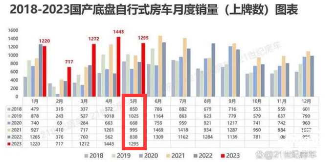 根據(jù)21世紀(jì)房車網(wǎng)提供的終端上牌數(shù)據(jù),2023年5月國產(chǎn)底盤自行式房車銷售1295輛,同比去年5月的883輛大漲55%(見截圖1),環(huán)比今年4月的1443銷量下降10.3%。