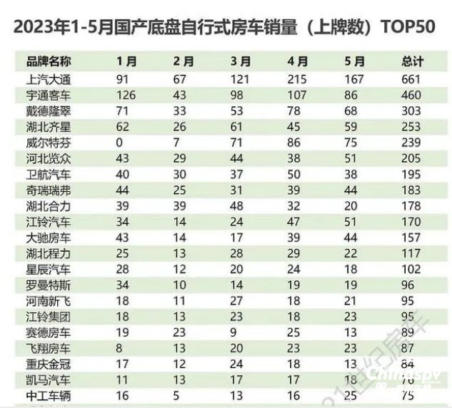 1、在2023年1-5月房車?yán)塾?jì)銷量TOP10中: