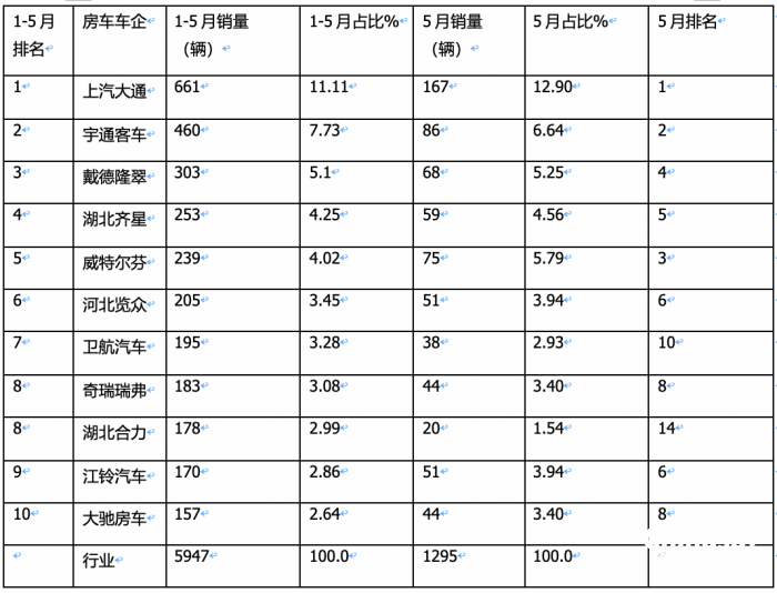 總之,在今年5月及1-5月房車市場中,上汽大通和宇通客車均奪得單月、累計(jì)“雙料”冠亞軍,這是當(dāng)下國產(chǎn)底盤自行式房車市場競爭領(lǐng)域的一個(gè)明顯特征。
