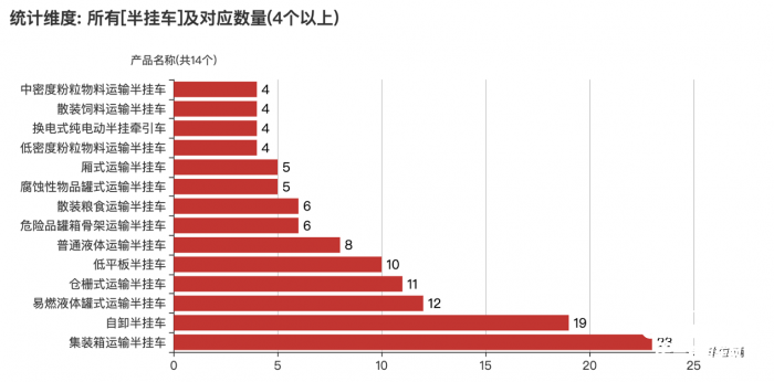 本次公告中的157款半掛車共包含38種車型,集裝箱運(yùn)輸半掛車(23輛)、自卸半掛車(19輛)、易燃液體罐式運(yùn)輸半掛車(12輛)、倉(cāng)柵式運(yùn)輸半掛車(11輛)、低平板半掛車(10輛)、普通液體運(yùn)輸半掛車(8輛)、危險(xiǎn)品罐箱骨架運(yùn)輸半掛車(6輛)、散裝糧食運(yùn)輸半掛車(6輛)、腐蝕性物品罐式運(yùn)輸半掛車(5輛)、廂式運(yùn)輸半掛車(5輛)、換電式純電動(dòng)半掛牽引車(4輛)、散裝飼料運(yùn)輸半掛車(4輛)、低密度粉粒物料運(yùn)輸半掛車(4輛)、中密度粉粒物料運(yùn)輸半掛車(4輛)、燃料電池半掛牽引車(3輛)、純電動(dòng)半掛牽引車(3輛)、平板運(yùn)輸半掛車(3輛)、半掛牽引車(3輛)、半掛牽引汽車(2輛)、液態(tài)食品運(yùn)輸半掛車(2輛)、液化氣體運(yùn)輸半掛車(2輛)、通信半掛車(2輛)、毒性和感染性物品罐式運(yùn)輸半掛車(1輛)、鋁合金運(yùn)油半掛車(1輛)、垃圾轉(zhuǎn)運(yùn)半掛車(1輛)、污水處理半掛車(1輛)、舞臺(tái)半掛車(1輛)、運(yùn)油半掛車(1輛)、乘用車輛運(yùn)輸半掛車(1輛)、壓縮式垃圾半掛車(1輛)、鋁合金易燃液體罐式運(yùn)輸半掛車(1輛)、吸污半掛車(1輛)、低溫液體運(yùn)輸半掛車(1輛)、氧化性物品罐式運(yùn)輸半掛車(1輛)、運(yùn)材半掛車(1輛)、危險(xiǎn)品運(yùn)輸半掛牽引車(1輛)、混凝土攪拌運(yùn)輸半掛車(1輛)、物料粉碎半掛車(1輛)。