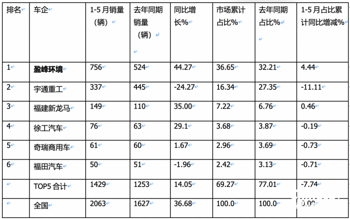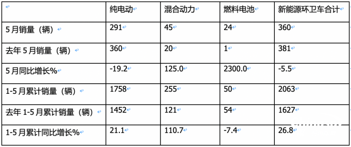 1-5月新能源環(huán)衛(wèi)車市場:同比增26.8%混動(dòng)領(lǐng)漲,盈峰環(huán)境、宇通、新龍馬居前三?
