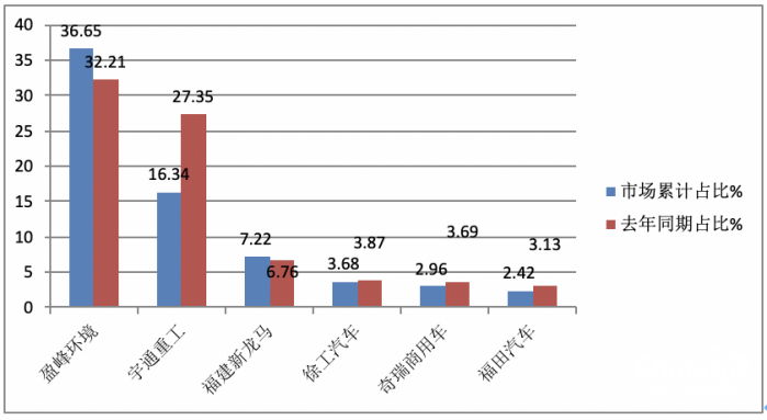 ----盈峰環(huán)境累計(jì)銷售756輛,居行業(yè)第一,累計(jì)同比增長44.27%,領(lǐng)漲行業(yè), 市場中占有率為36.65%,占比同比增加4.44個(gè)百分點(diǎn),是行業(yè)市場份額增加最大的車企,表現(xiàn)出色;