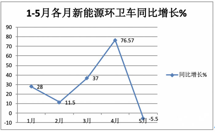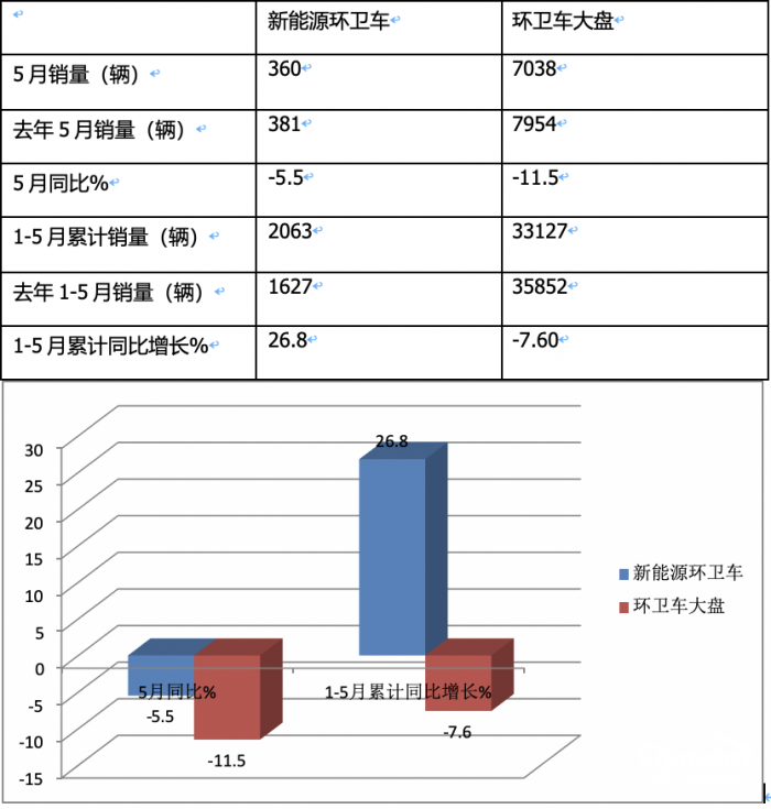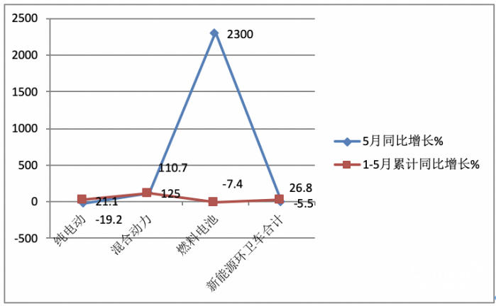 上圖表顯示:在今年5月及1-5月各類新能源環(huán)衛(wèi)車銷量同比中: