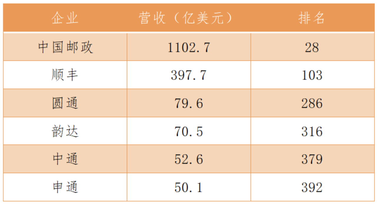 榜單顯示,中國(guó)郵政營(yíng)收1102.7億美元,排名第28位,順豐營(yíng)收397.7億美元,排名第103位,圓通、韻達(dá)、中通、申通分別以79.6億美元、70.5億美元、52.6億美元和50.1億美元的營(yíng)收排名第286、316、379及392位。
