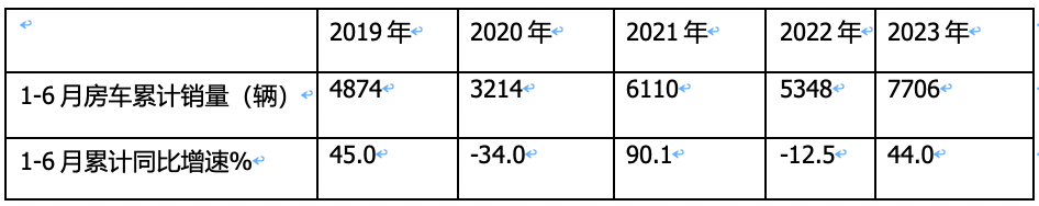 ---2023年1-6月累計銷售7706輛,創(chuàng)下近5年同期新高,也是近5年同期中唯一銷量超過7000輛的月份。而且銷量與疫情之前的2019年1-6月的4874輛銷量比較高出2832輛,說明今年上半年的房車市場不但已經(jīng)完全恢復(fù),而且是表現(xiàn)最為出色的年份,主要是近年受疫情影響而被壓抑的需求得到了釋放,同時隨著生活質(zhì)量的提高,人們越來越重視旅游了。