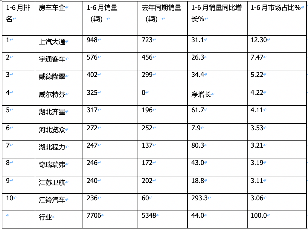 實銷7706輛增44%,大通、宇通、戴德隆翠居前三-2023年上半年國產(chǎn)底盤自行式房車銷量特點簡析