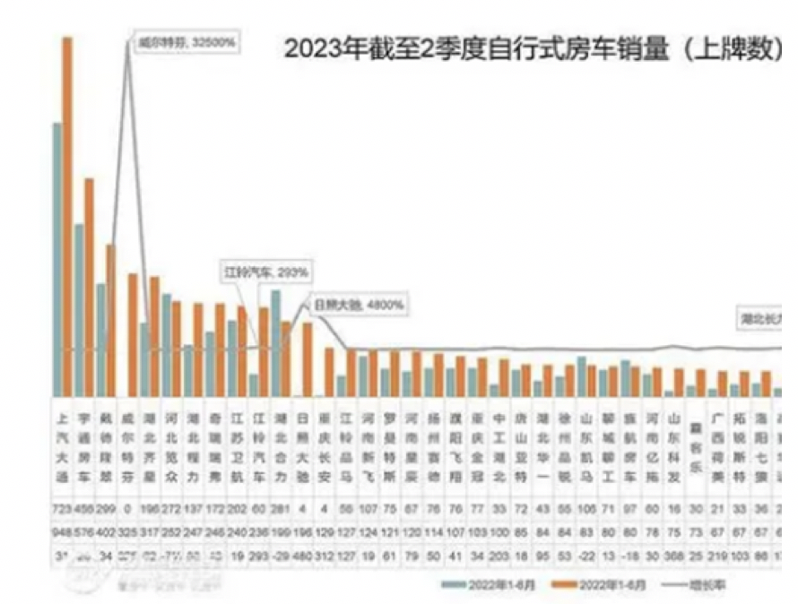 截圖2,2023年1-6月主流車企的國產(chǎn)自行式房車銷量及同比(數(shù)據(jù)來源:21世紀(jì)房車提供的上牌信息)