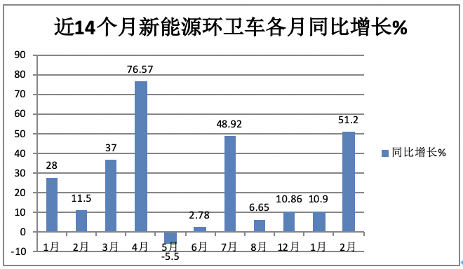 上圖表顯示,在2023年1月--2024年2月近14月各月新能源環(huán)衛(wèi)車銷量及同比: