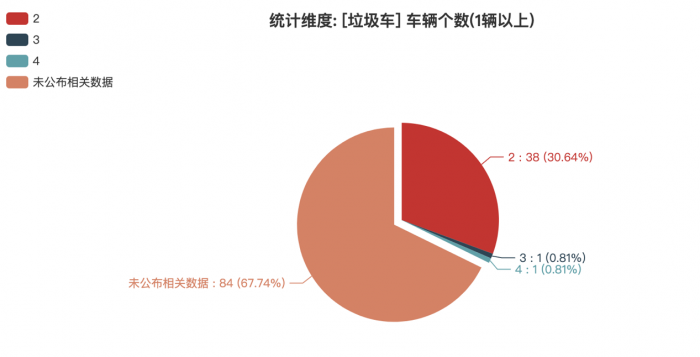 本次公告中的124款垃圾車中,2軸(38輛,占比30.65%)、3軸(1輛,占比0.81%)、4軸(1輛,占比0.81%)、未公布相關數據(84輛,占比67.74%)。