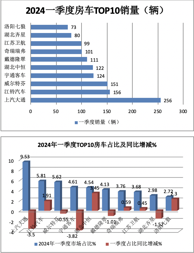 上圖表顯示,在2024年一季度房車?yán)塾?jì)銷量TOP10中: