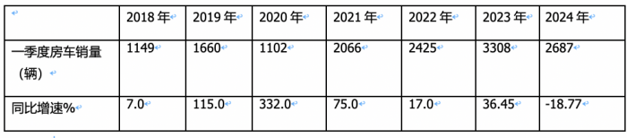 上表可見,在近7年一季度的房車銷量中,2024年的銷量為2687輛,居近7年同期第二。從同比增幅看,其增幅為-18.77%,居近7年同期最低。