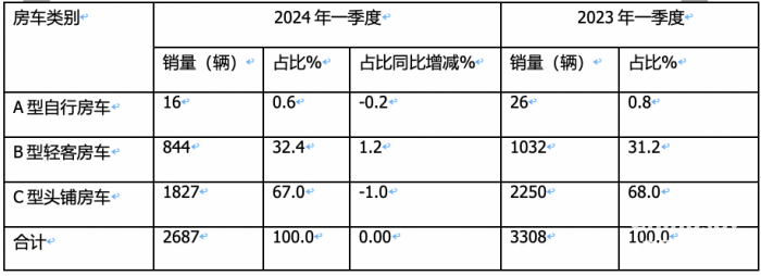 表3,根據(jù)終端上牌數(shù)據(jù),按產(chǎn)品類別劃分,2024年一季度各類房車銷量、占比及占比同比增增減: