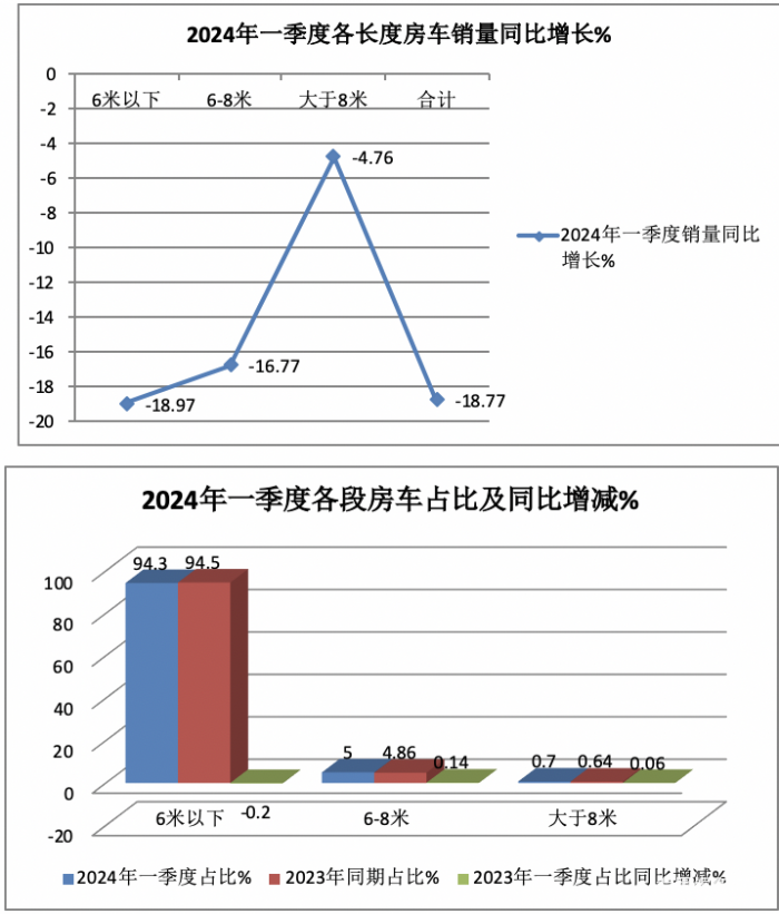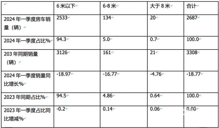 表2,按車型長(zhǎng)度段劃分,2024年一季度及2023年同期房車市場(chǎng)銷量及同比情況統(tǒng)計(jì)(數(shù)據(jù)來(lái)源:終端上牌信息)