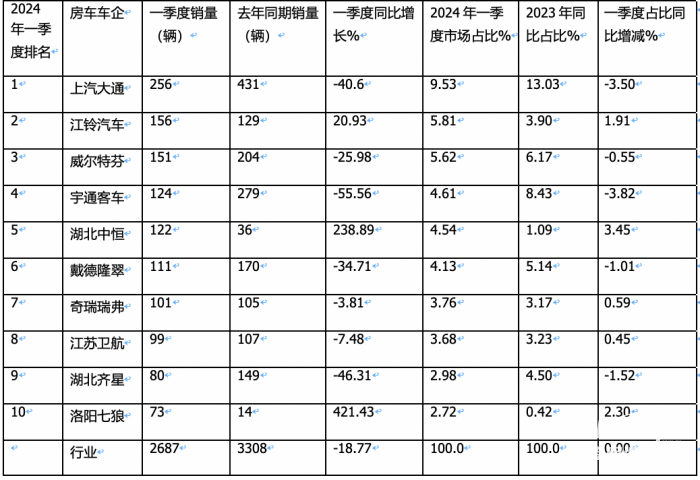 2024年一季度房車銷量特點(diǎn)總結(jié)分析:?實(shí)銷2687輛降18.77%,大通\江鈴\威爾特芬居前三