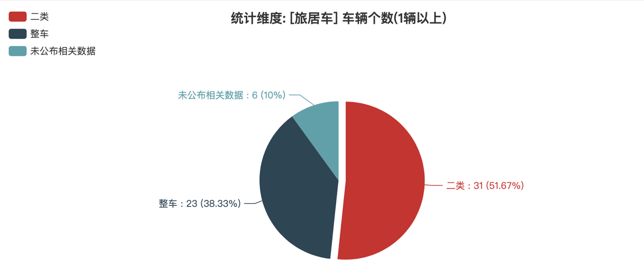 本次公告中的60款旅居車中,二類(31輛,占比51.67%)、整車(23輛,占比38.33%)、未公布相關(guān)數(shù)據(jù)(6輛,占比10%)。