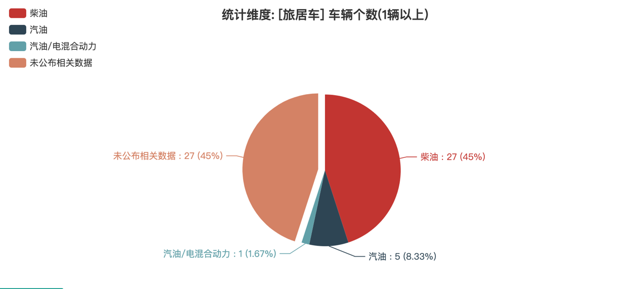 本次公告中的60款旅居車中,柴油(27輛,占比45%)、汽油(5輛,占比8.33%)、汽油/電混合動力(1輛,占比1.67%)、未公布相關(guān)數(shù)據(jù)(27輛,占比45%)。
