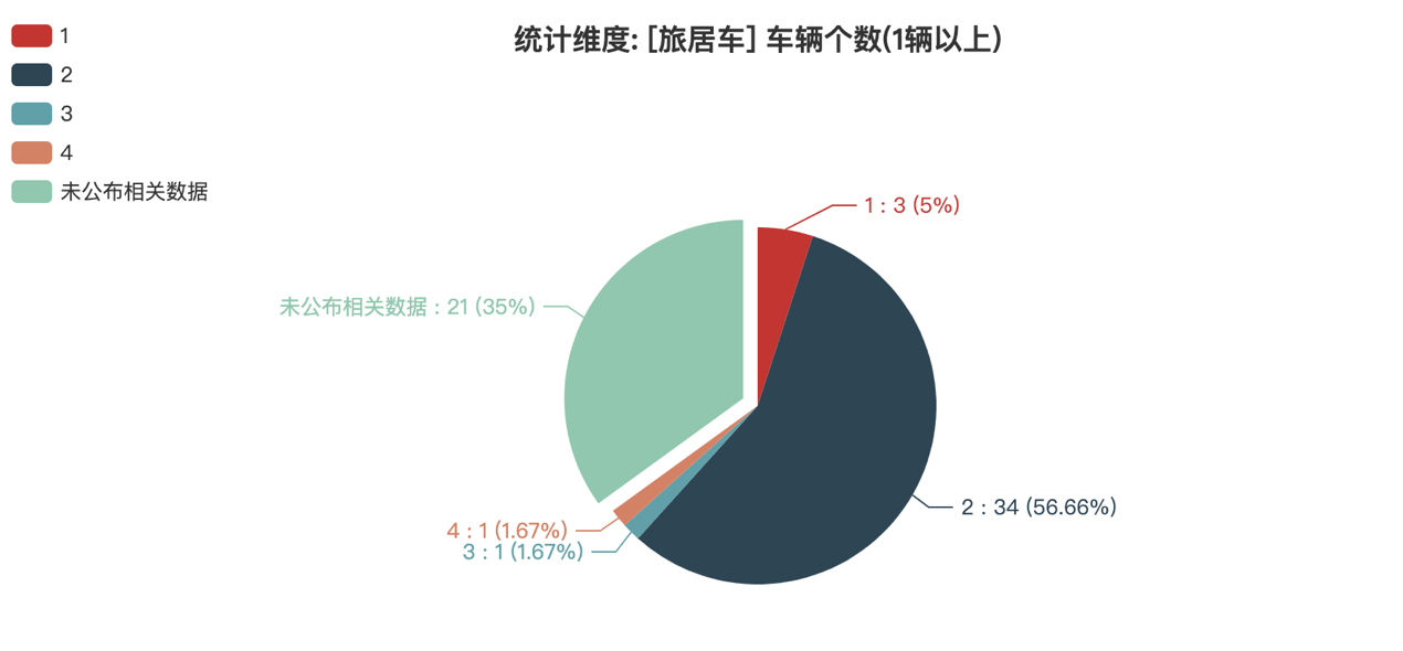 本次公告中的60款旅居車中,1軸(3輛,占比5%)、2軸(34輛,占比56.67%)、3軸(1輛,占比1.67%)、4軸(1輛,占比1.67%)、未公布相關(guān)數(shù)據(jù)(21輛,占比35%)。