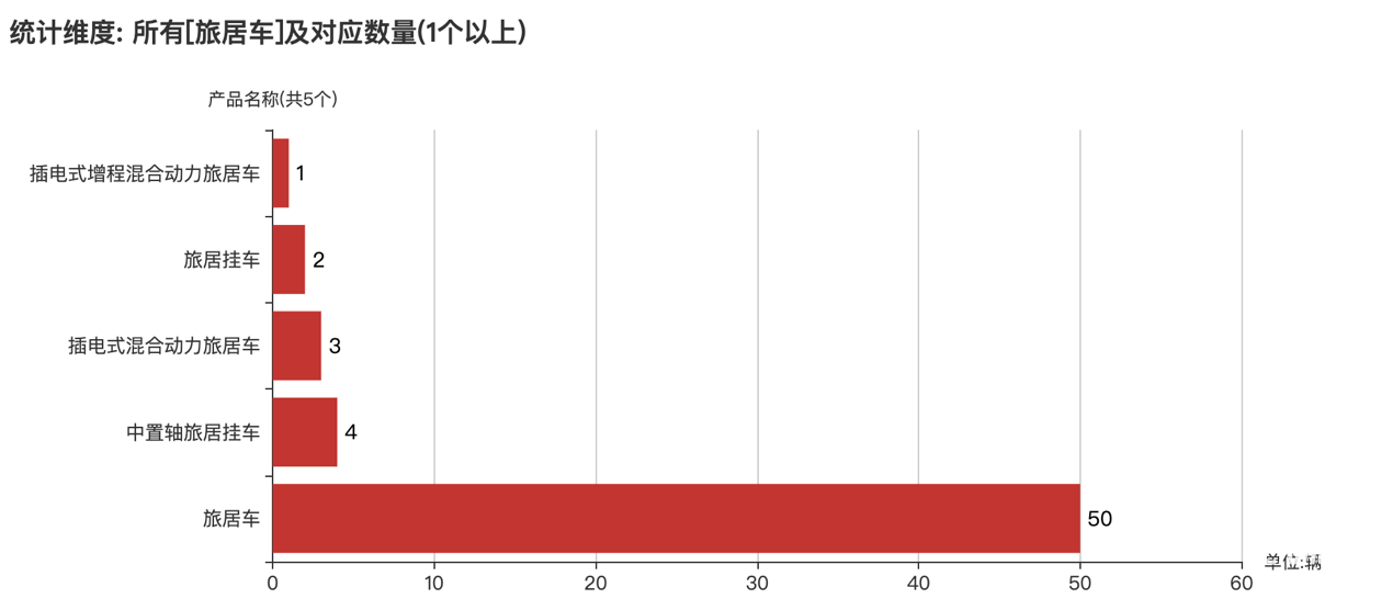本次公告中的60款旅居車的車型共有5種,旅居車(50輛)、中置軸旅居掛車(4輛)、插電式混合動力旅居車(3輛)、旅居掛車(2輛)、插電式增程混合動力旅居車(1輛)。