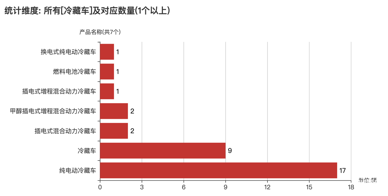 本次公告中的33款冷藏車的車型共有7種,純電動(dòng)冷藏車(17輛)、冷藏車(9輛)、插電式混合動(dòng)力冷藏車(2輛)、甲醇插電式增程混合動(dòng)力冷藏車(2輛)、插電式增程混合動(dòng)力冷藏車(1輛)、燃料電池冷藏車(1輛)、換電式純電動(dòng)冷藏車(1輛)。