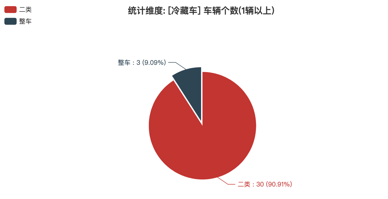 本次公告中的33款冷藏車中,二類(30輛,占比90.91%)、整車(3輛,占比9.09%)。