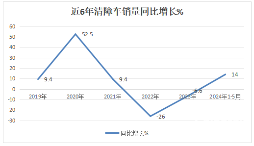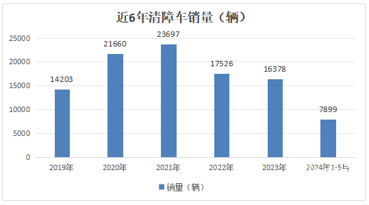 根據(jù)公開信息,2019年—2021年清障車銷量同比均為正增長,2022年銷量相對2021年則出現(xiàn)下滑,2023年同比繼續(xù)下滑,2024年1-5月則出現(xiàn)同比14%的增長。